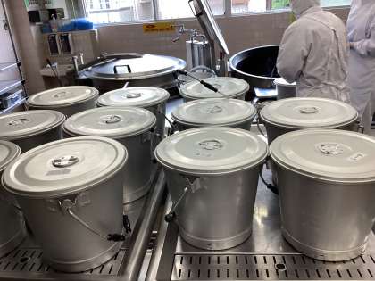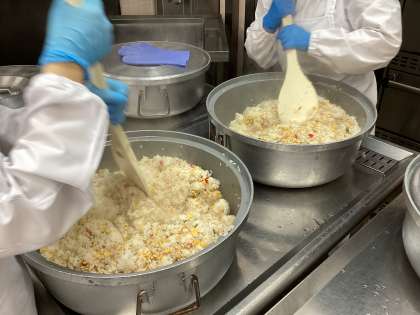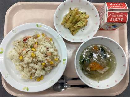 今日の給食は、ナシゴレン、牛乳、青のりフライドポテト、野菜スープです。