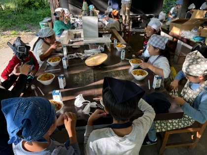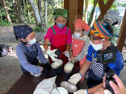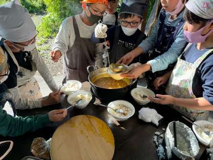 飯盒炊爨をしました。水加減、火加減が難しかったのですが、みんな上手に作ることができました。おこげのあるご飯は美味しいですね。