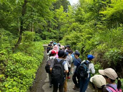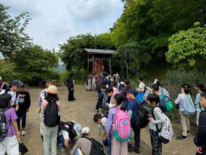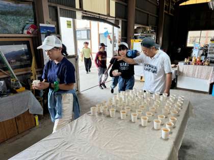 村巡りをしています。途中、宮田果樹園さんでリンゴジュースをいただきました。美味しかったです。その後、大きなわらじの前で記念写真を撮りました。