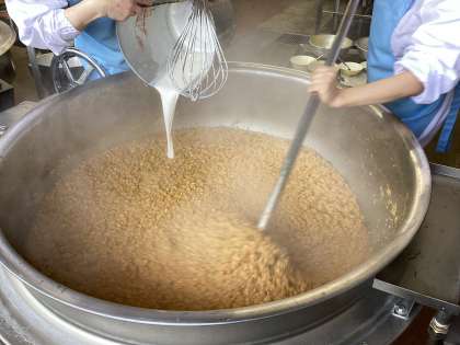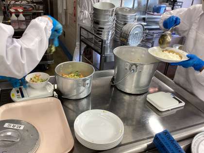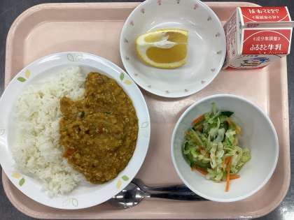 今日の給食は、キーマカレーライス、牛乳、フレンチサラダ、くだもの(河内晩柑)です。