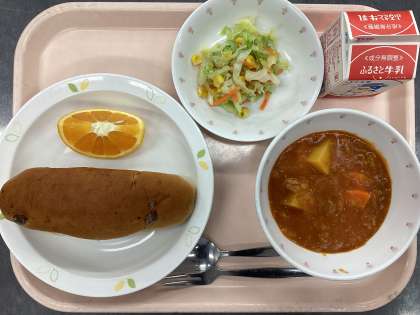 今日の給食は、ぶどうパン、牛乳、トマトシチュー、コーンサラダ、くだもの(オレンジ)です。