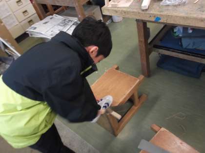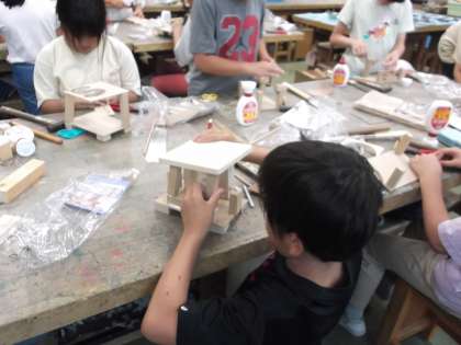 のこぎりを使って木片を切り、ボンドを使って組み合わせています。