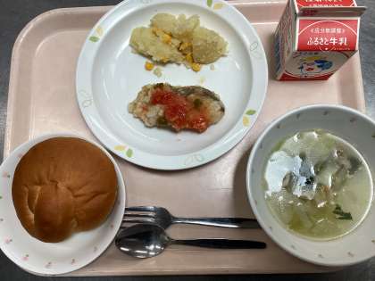 今日の給食は、マーガリンパン、牛乳、魚のエスカベージュ、コーンポテト、豚肉とキャベツのスープです。