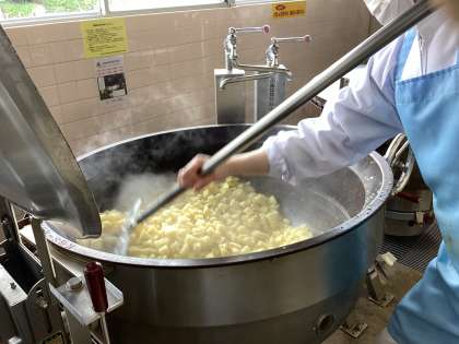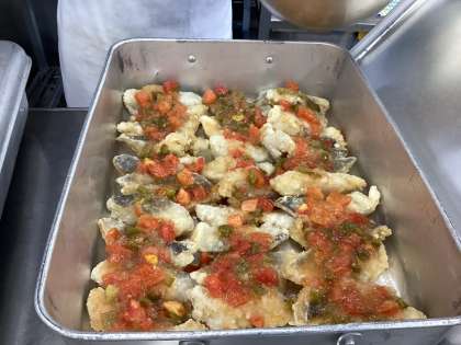 エスカベージュとは、フランス語で「油で揚げてから酢に漬ける」という意味で、地中海地方の料理です。魚を唐揚げにして、酢、油などで作ったマリネ液に漬け込みます。給食では、トマト、ピーマン、玉ねぎを入れたマリネソースを作りました。