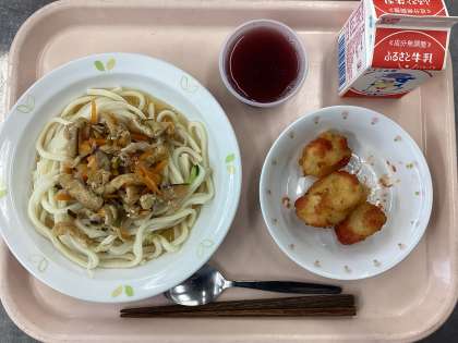 今日の給食は、五目冷やしうどん、牛乳、ポテトドッグ、ぶどうゼリーです。