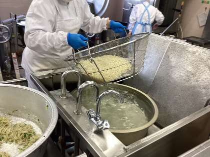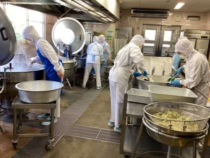 今日の天気にもぴったりな五目冷やしうどんは、冷たいうどんとつゆで食も進みます。給食室では麺や野菜、つゆを加熱し、また冷やすという作業を何度も何度も繰り返すので、朝から大忙しでした。冷やし麺は、作業工程が多く、とても手間のかかっている献立です。
