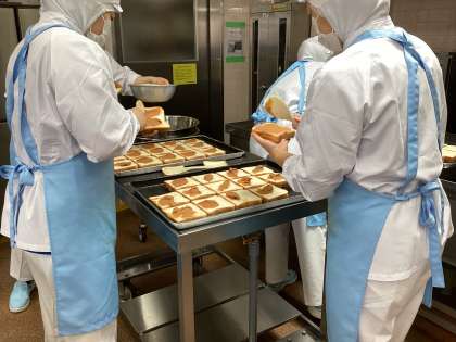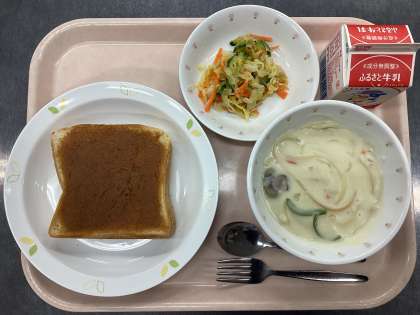 今日の給食は、きなこバタートースト、牛乳、シシリアン、イタリアンサラダです。