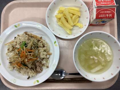 今日の給食は、ビビンバ、牛乳、フライドポテト、鶏肉と冬瓜のスープです。
