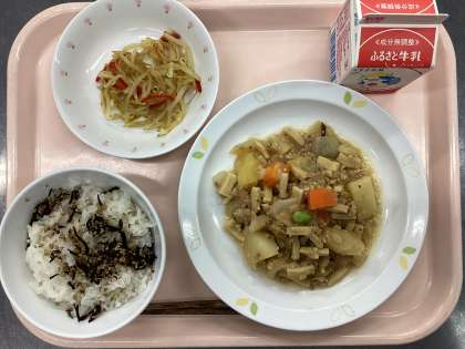 今日の給食は、麦ごはん、牛乳、ひじきのふりかけ、じゃがいものそぼろ煮、もやしのからしじょうゆがけです。