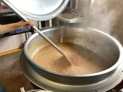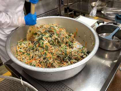 今日の給食は、ジャージャーうどん、牛乳、塩ナムル、パインヨーグルトです。
