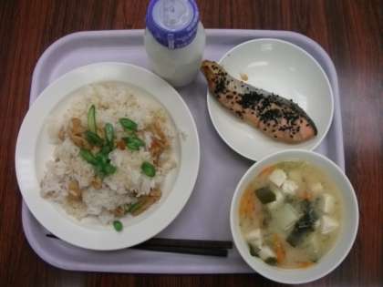 今日の給食は、こぎつねごはん 牛乳 鮭の南部焼き みそ汁 です。