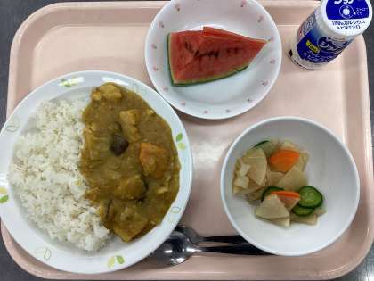 今日の給食は、夏野菜のチキンカレーライス、セレクトドリンク、シャキシャキ野菜、くだもの(小玉すいか)です。
