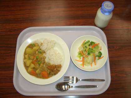 今日の給食は、ビーンズカレーライス 牛乳 福神漬け 野菜の甘酢かけ です。