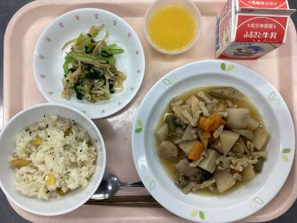今日の給食は、栗ごはん、牛乳、鶏肉と里芋のうま煮、菊の花入りおひたし、フルーツゼリーです。