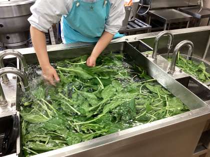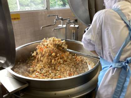重陽の節句は秋の収穫祭と結びついていったため、お祝い膳には秋の食材が並びます。栗や菊を使った料理、また、月に見立てた里芋などが行事食として食べられています。今日は、栗ごはん、鶏肉と里芋のうま煮に里芋、なすを入れ、菊の花を入れたおひたしを行事食として取り入れました。