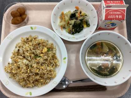 今日の給食は、ツナそぼろごはん、牛乳、大根とわかめのサラダ、吉野汁、月見だんごです。