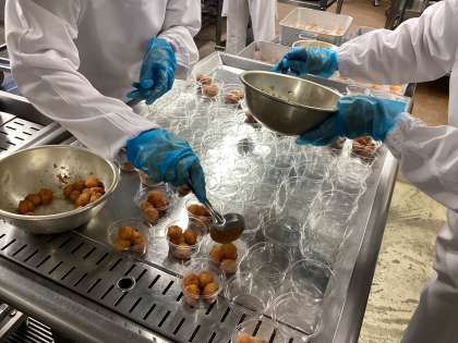 また、満月に見立てた丸いだんごや里芋、季節の農産物をお供えし、収穫に感謝する意味もあります。今日の給食には、お月見にちなんで月見だんごを取り入れました。吉野汁にも月にうさぎの形をしたかまぼこも入っています。少しわかりにくいですが、探してみてくださいね。