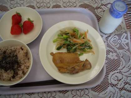 今日のメニューは、赤飯、牛乳、鶏肉のてり焼き、野菜のごまだれかけ、くだものです。