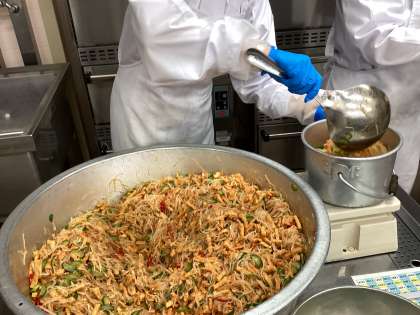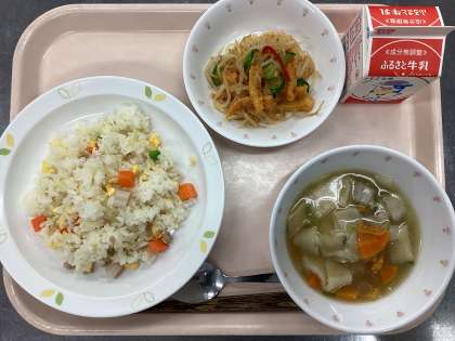 今日の給食は、チャーハン、牛乳、もやしのコチュジャンがけ、ワンタンスープです。