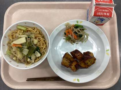 今日の給食は、チャンポン麺、牛乳、大学いも、塩ナムルです。