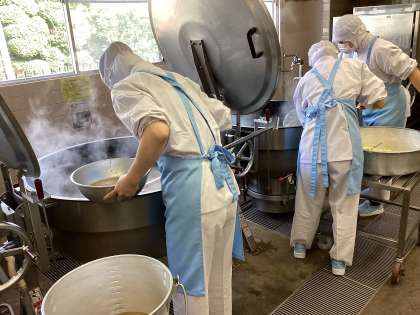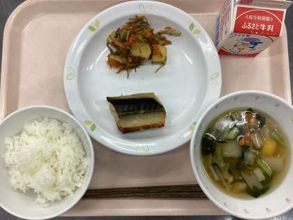 今日の給食は、ごはん、牛乳、魚のみそ焼き、刻み昆布の五目煮、かぼちゃの団子汁です。