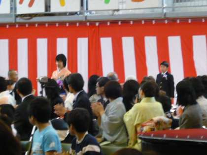 4,5年生による楽器の演奏と共に卒業生が入場しました。一人ずつ、保護者の方に見守られながらの入場です。(左)