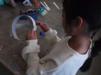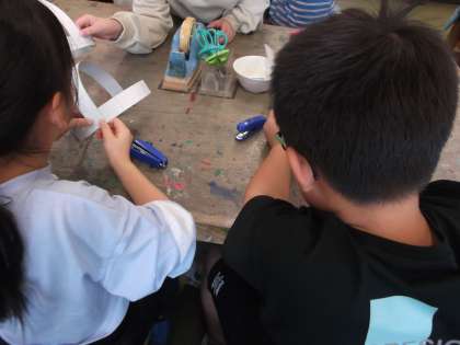 自分の頭のサイズを確認しながら、ステープラーで留めています。