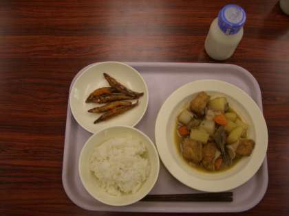 今日の給食は、ごはん 牛乳 五目うま煮 きびなごのから揚げ です。