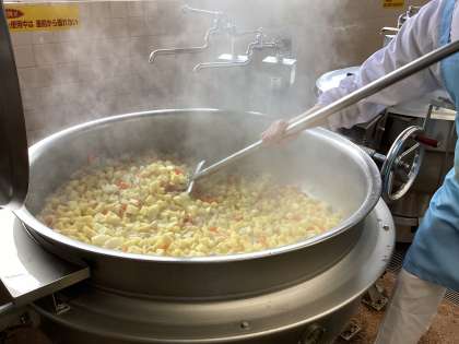 今日の給食は、二色サンド(クリームチーズ・いちごジャム)、牛乳、ポークシチュー、野菜のレモンサラダです。