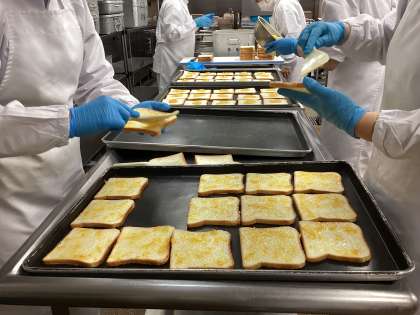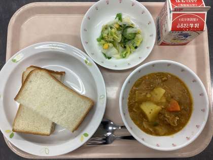 今日の給食は、マーマレードジャムサンド、牛乳、ハンガリアンシチュー、白菜とコーンのサラダです。