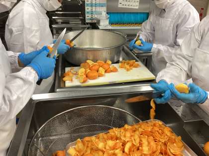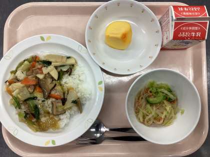 今日の給食は、中華丼、牛乳、春雨サラダ、くだもの(柿)です。