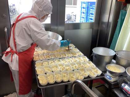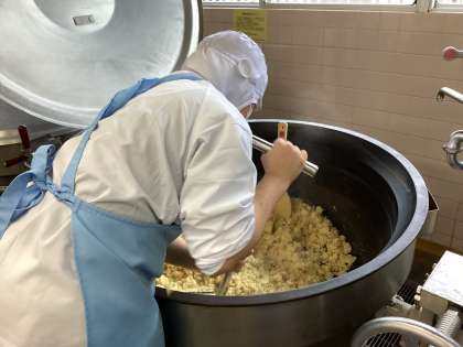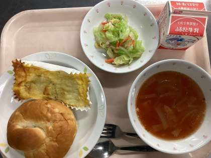 今日の給食は、パインパン、牛乳、フレンチエッグ、キャベツサラダ、トマトスープです。