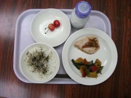 今日の給食は、ごはん 手作りふりかけ 牛乳 魚のしょうが風味焼き