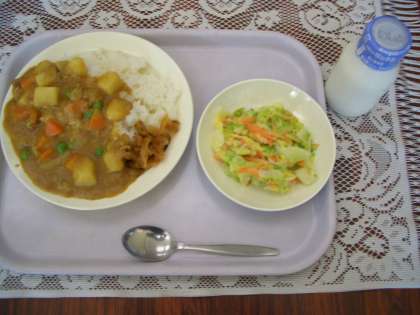 今日のメニューは、カレーライス、福神漬け、牛乳、キャベツサラダです。
