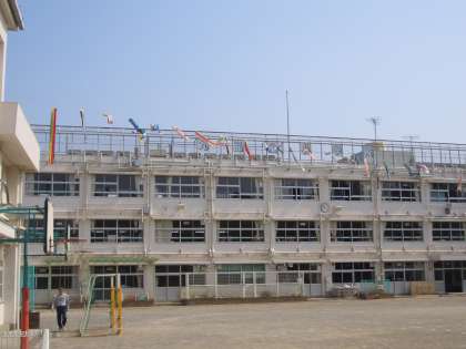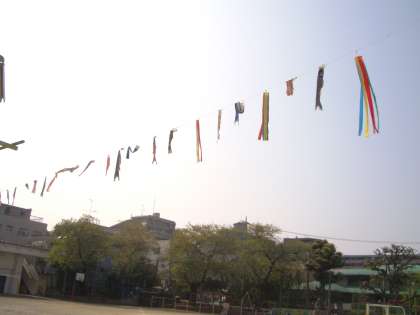 今、九品仏小学校の校庭には、“こいのぼり”が風にふかれて泳いでいます。その下で、子どもたちは、体育の授業を行ったり、休み時間に思い切り遊んだりしています。九品仏小学校では、このように季節感を大切にしています。準備は、主事さん方がチームワークよく作業していました。