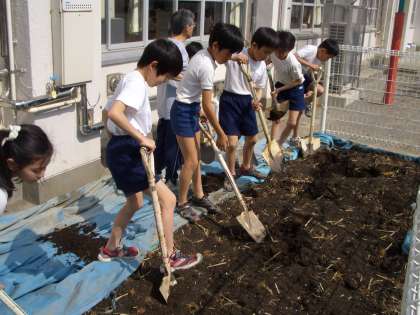 今日、5年生が校庭の小さな「田んぼ」の田起こしを行いました。地域の方の協力のもと担任の先生と5年生全員が取り組みました。このほかに一人一人が「バケツ稲」にも挑戦します。毎年、小さな田んぼで“米作り”をしています。稲穂が頭を垂れるまでに、いろいろな出来事があり、きっと取り組みの過程で様々な発見をすることでしょう。