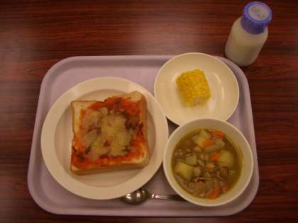 今日の給食は、ピザトースト 牛乳 ひよこ豆のカレースープ とうもろこし です。