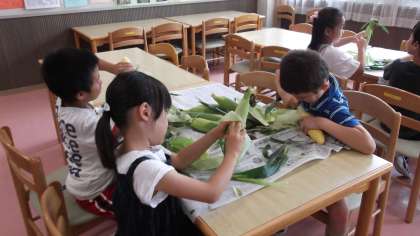今日1年生は生活科の学習でとうもろこしの皮むきに挑戦しました。1年生がむいたとうもろこしは、今日の給食となりました。