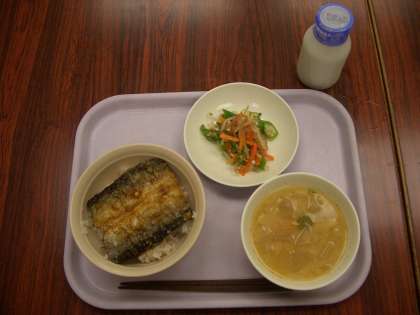 今日の給食は、さんまの蒲焼き丼 牛乳 とうがん汁 おくらのおひたし です。