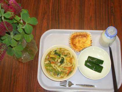 今日のメニューは、カレーうどん、牛乳、チーズケーキ、きゅりの甘酢かけです。