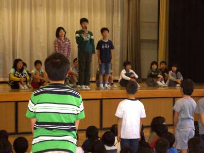 はじめに、各クラスから選ばれた代表の児童からなる「代表委員会の紹介」です。画面では、代表委員会の会長(6年生)、副会長(6年女子・5年男子)フロアーに立っている児童は、各クラスから選ばれた代表委員です。