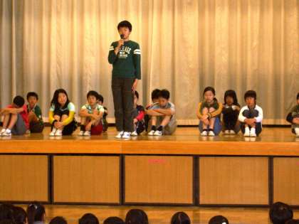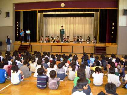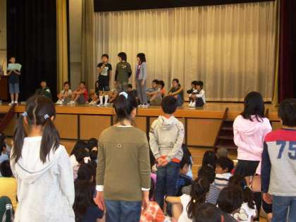 本校の委員会は、代表委員会、集会委員会、放送委員会、飼育 栽培委員会、図書委員会、保健 給食委員会です。各委員会の委員長さん、副委員長さんが舞台の上に、各委員会のメンバーは、フロアーでたっています。全校児童が代表委員会長をはじめ、委員長さん、委員会のメンバーの児童を知ることができる集会です。