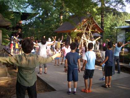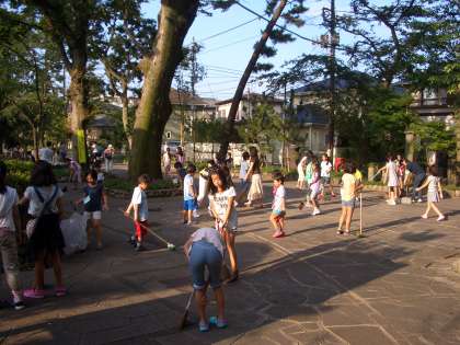 九品仏自治会主催のラジオ体操が7月22日〜31日の予定で九品仏浄真寺境内で行われています。ラジオ体操後は竹ぼうきを手に清掃活動にも取り組んでいます。参加する子どもが多く、自治会の方も喜んでいます。
