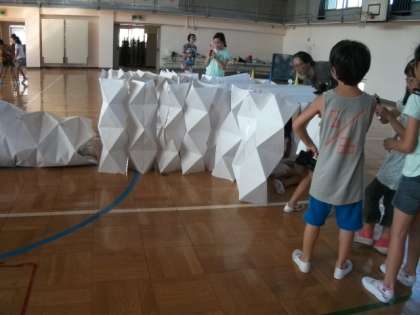 サマースクールの最終回は、建築家のパパさんたちが講師の講座です。大きな折り紙の作品をつなぎ合わせ中に入って遊びました。