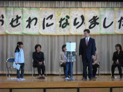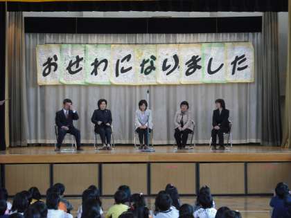 4月28日(火)の午後に「離任式」を行いました。九品仏小学校でご尽力いただいた教職員の方々との“お別れの式”です。11名の教職員が退職・異動しました。ご都合が悪く欠席の方がいましたが、5名の教職員が出席され、子どもたちとお別れしました。その様子をご覧ください。
