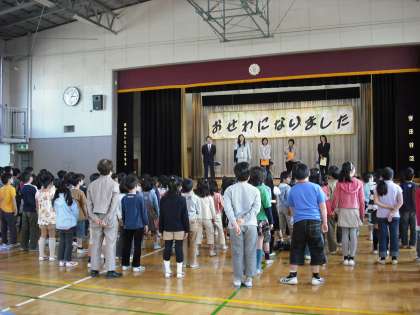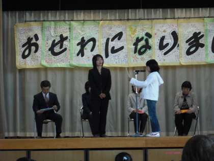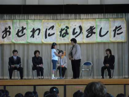 離任式には、副校長先生、嘱託の先生、養護の先生、用務主事さん、給食調理員さんの5名が出席されました。みなさん、異動先でがんばっている様子をお話しされ、また、九品仏小学校の思い出も話され・・・子どもたちの心に響いたお話もたくさんありました。