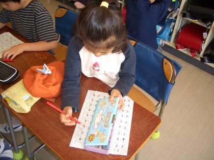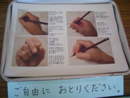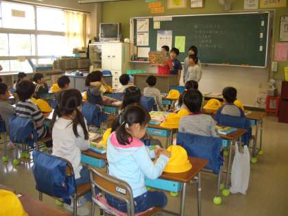 1年生は、6年生による“紙芝居”を真剣なまなざしで見ていました。このあと、2年生と「はたらくしょうぼうのえ」を描くので、机上には“帽子・クレパス”の準備もしてありました。また、廊下には、「正しい鉛筆の持ち方」の資料がおいてあります。学校と家庭が協力して、正しい持ち方が身につくように担任の先生の思いが伝わってきます。