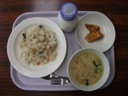今日の給食は、えびピラフ 牛乳 タンドリーチキン チーズのふわふわスープ です。