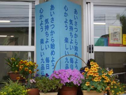本校は、10余年前より、地域(自治会・同窓会・九品仏商店会など)の方々と学校とが協力して、“あいさつ運動”をしています。玄関の中央には、「あいさつから 始めよう気持ちのよい毎日 心かよう 楽しい九品仏小」という看板(2枚目)があります。この地域の方々の温かい気持ちを受けて、昨日紹介した校長先生・代表委員会のメンバー(曜日で分担)が“あいさつマン”として、登校してくる児童並びに玄関の前を通る方々にあいさつをしています。できることを大切にした取り組みです。