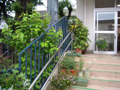 また、看板のしたには、色とりどりの草花があります。玄関の階段横のにもあります。